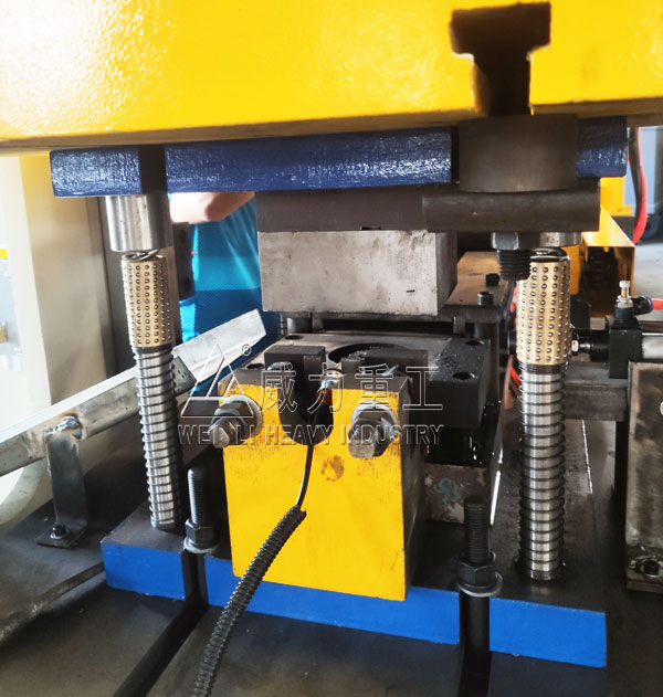 4、當工件頂出后,夾鉗松開,主機開始工作,工件被壓緊時,夾鉗繼續回退,同時400噸閉式液壓沖床將板材剪斷、成型及沖孔一次性完成;